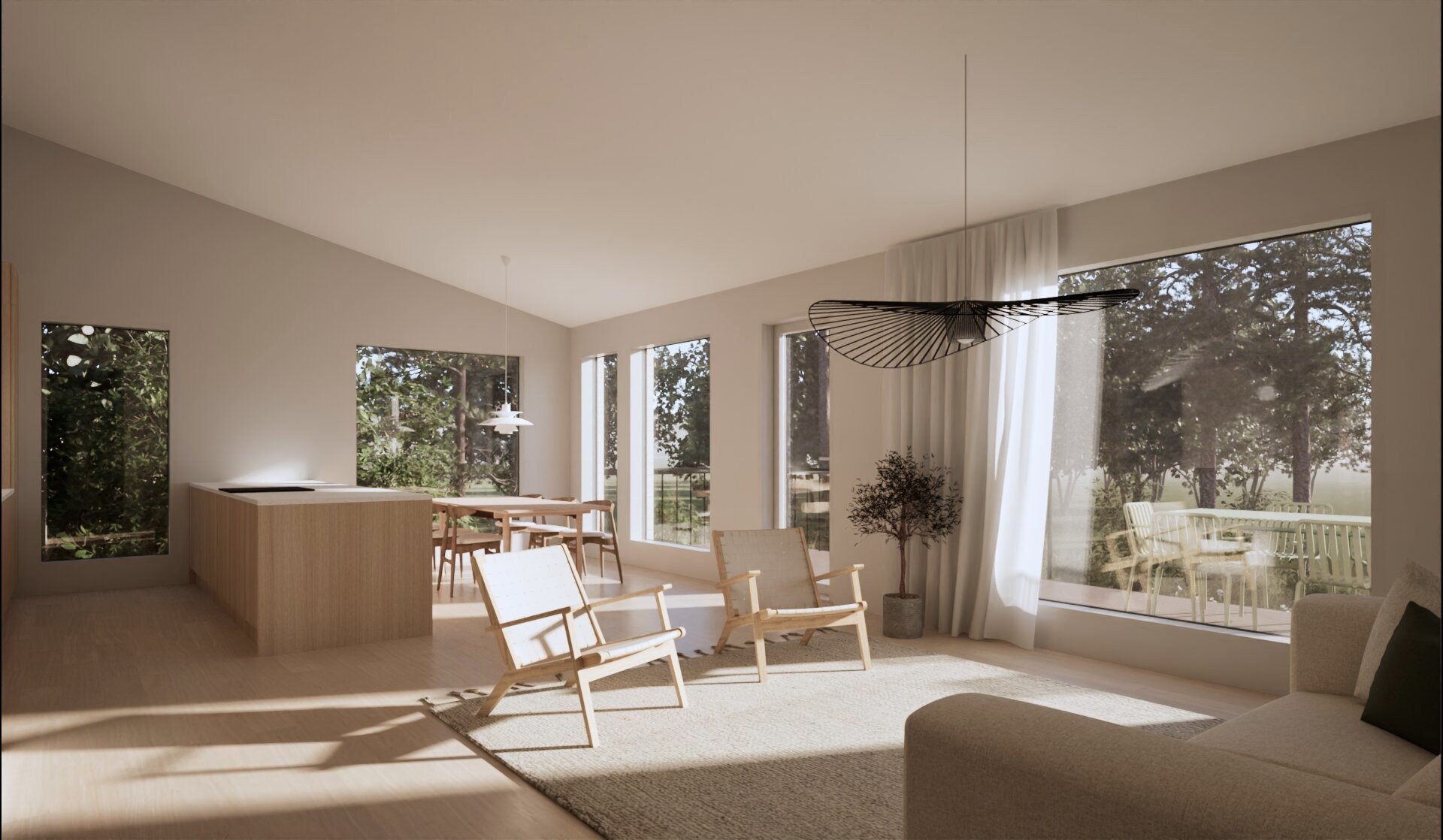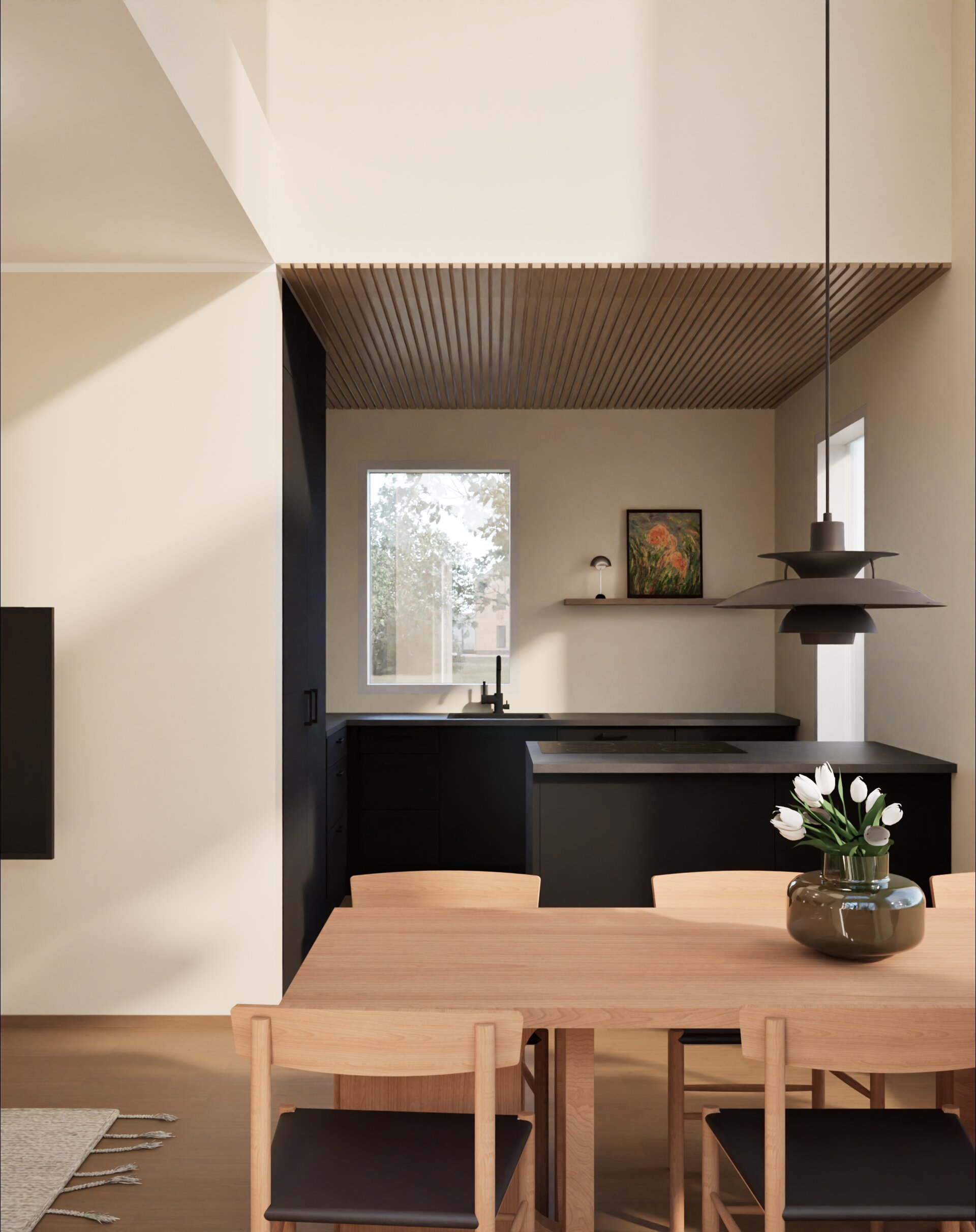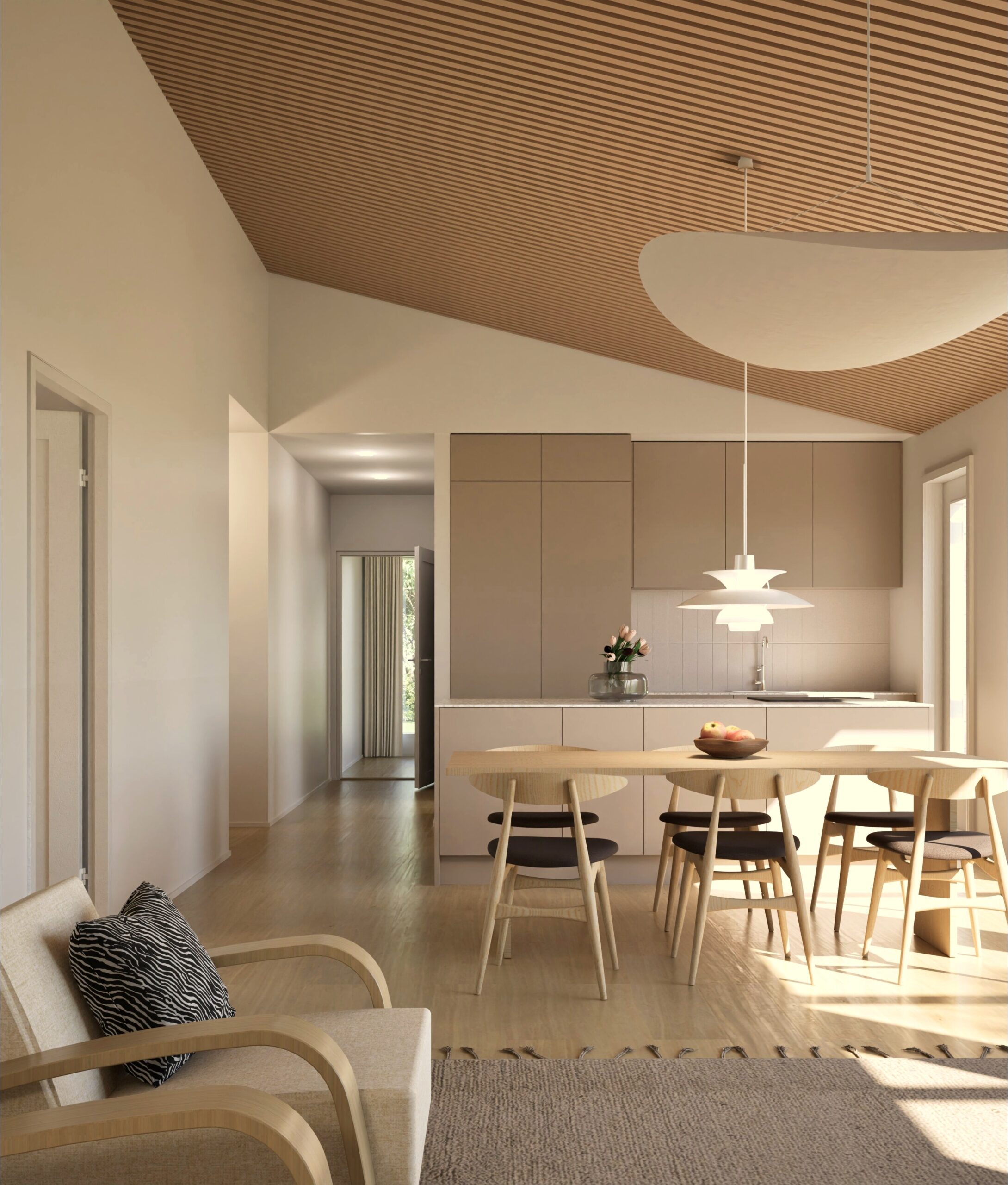 Tässä kodissa vaalitaan tasapainoa ja arjen kauneutta. Sisustuksessa on suosittu luonnonvaloa tulvivaa tilaa, pehmeitä materiaaleja ja puuta. Arjen estetiikka näkyy rauhallisina sävyinä ja viimeistellyssä yksinkertaisuudessa.