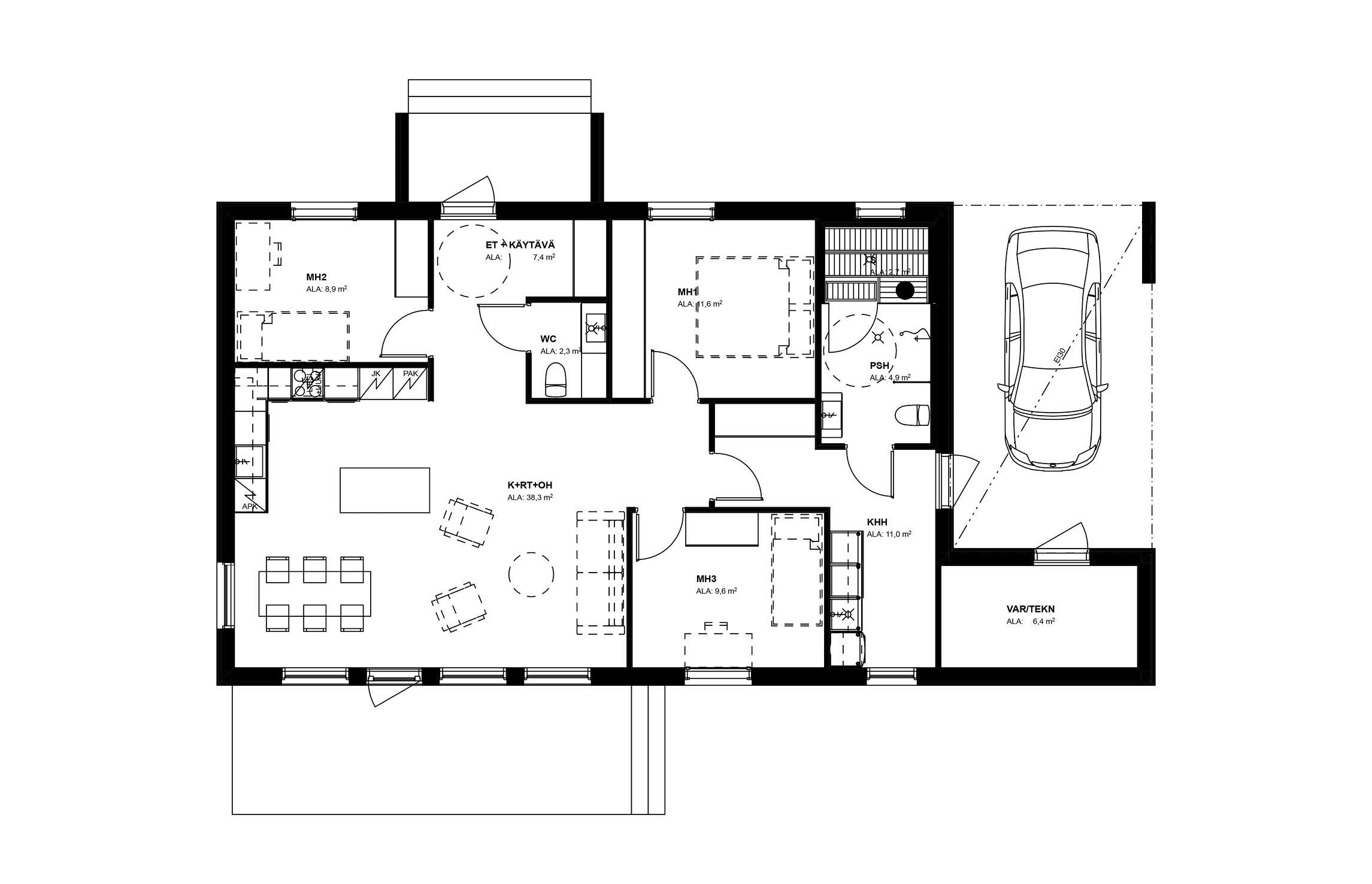 Tähän esimerkkikotiin on Jukkatalon vakiotoimitussisällön lisäksi valittu: